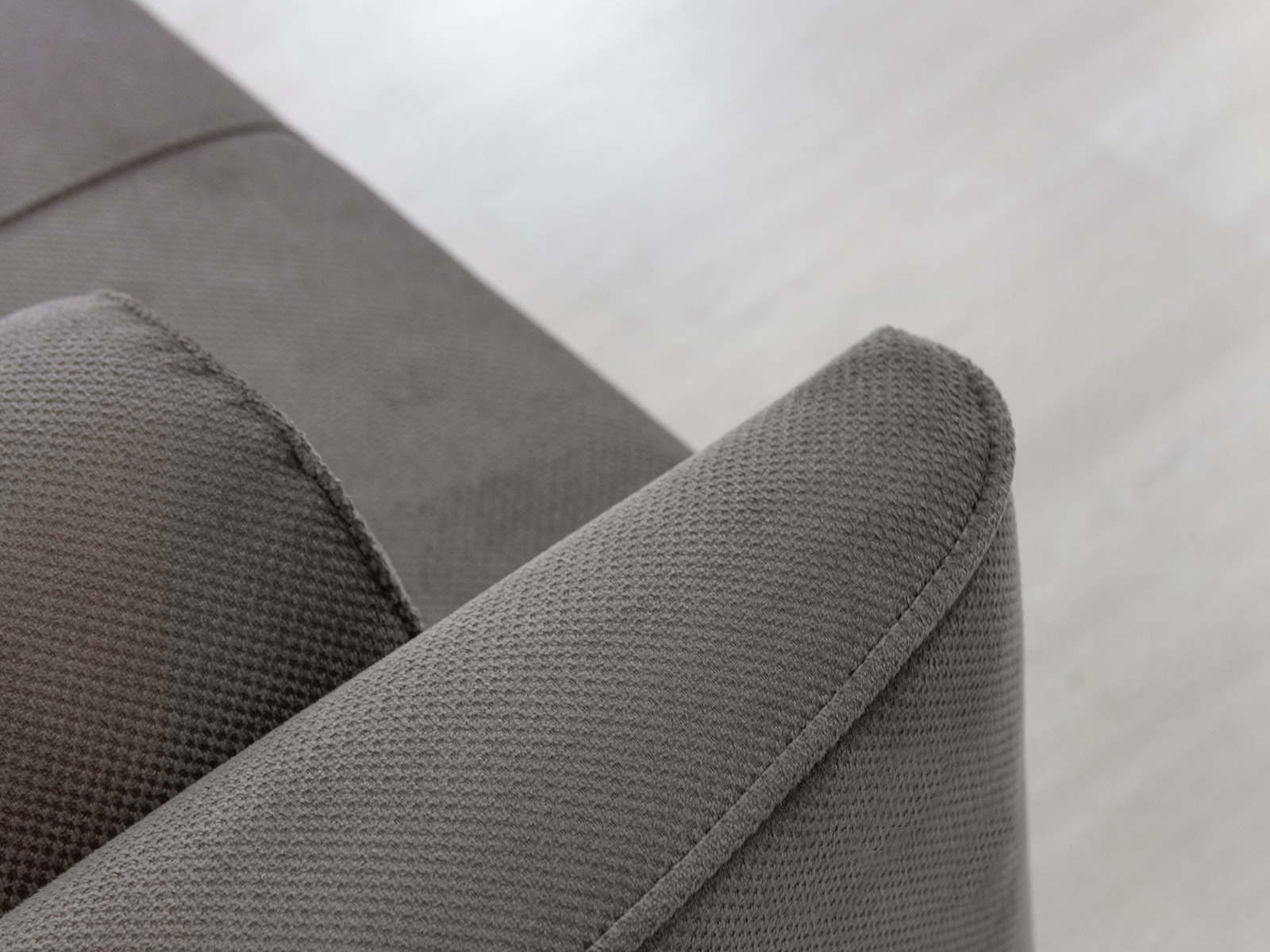 На фронтальной части спинки дивана прострочены защипы (3 шт.). По торцам втачен кант. На декоративных валиках прострочены защипы -2 шт. и защип вдоль круглого торца. Сидение имеет 3 защипа. Верхний торец подлокотников полукруглый, на ребре полукруга втачен кант.