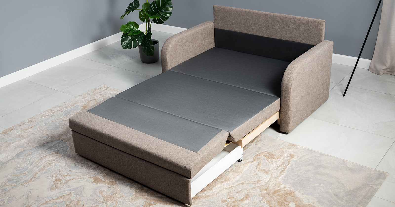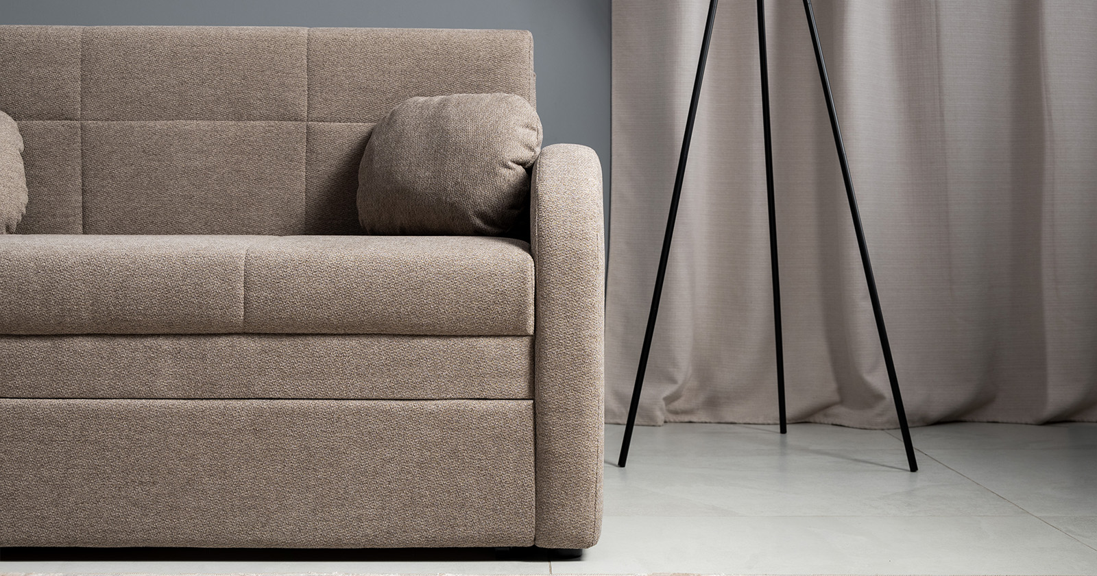 Коллекция выполнена в современном минималистичном стиле с мягкой обивкой из износостойкой ткани и декоративной стежкой, подчеркивающей геометрию форм. Механизм трансформации обеспечивает дополнительное спальное место, делая мебель не только эстетичной, но и максимально функциональной для небольших пространств.