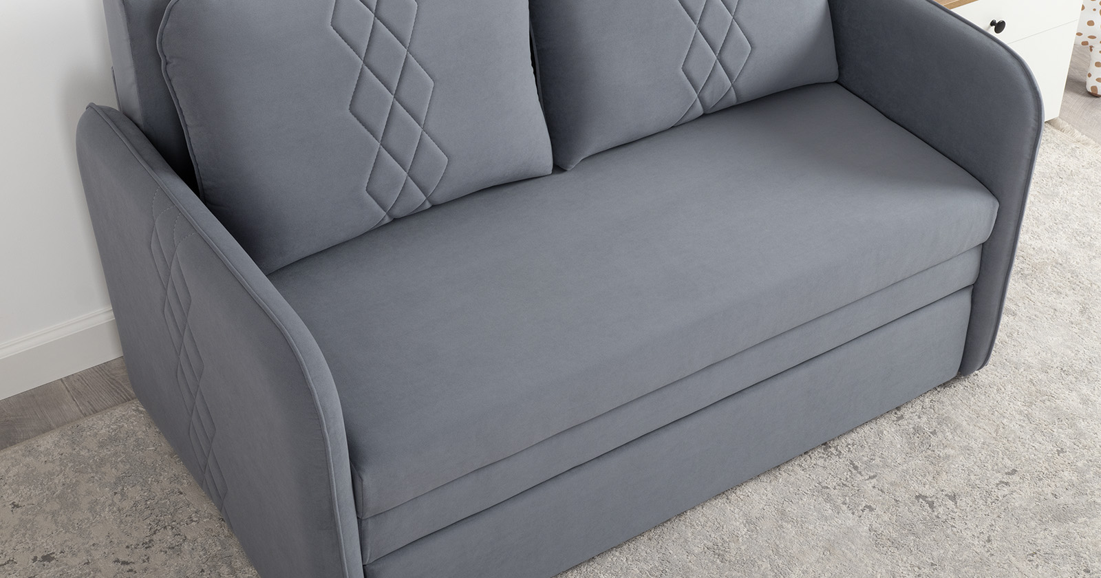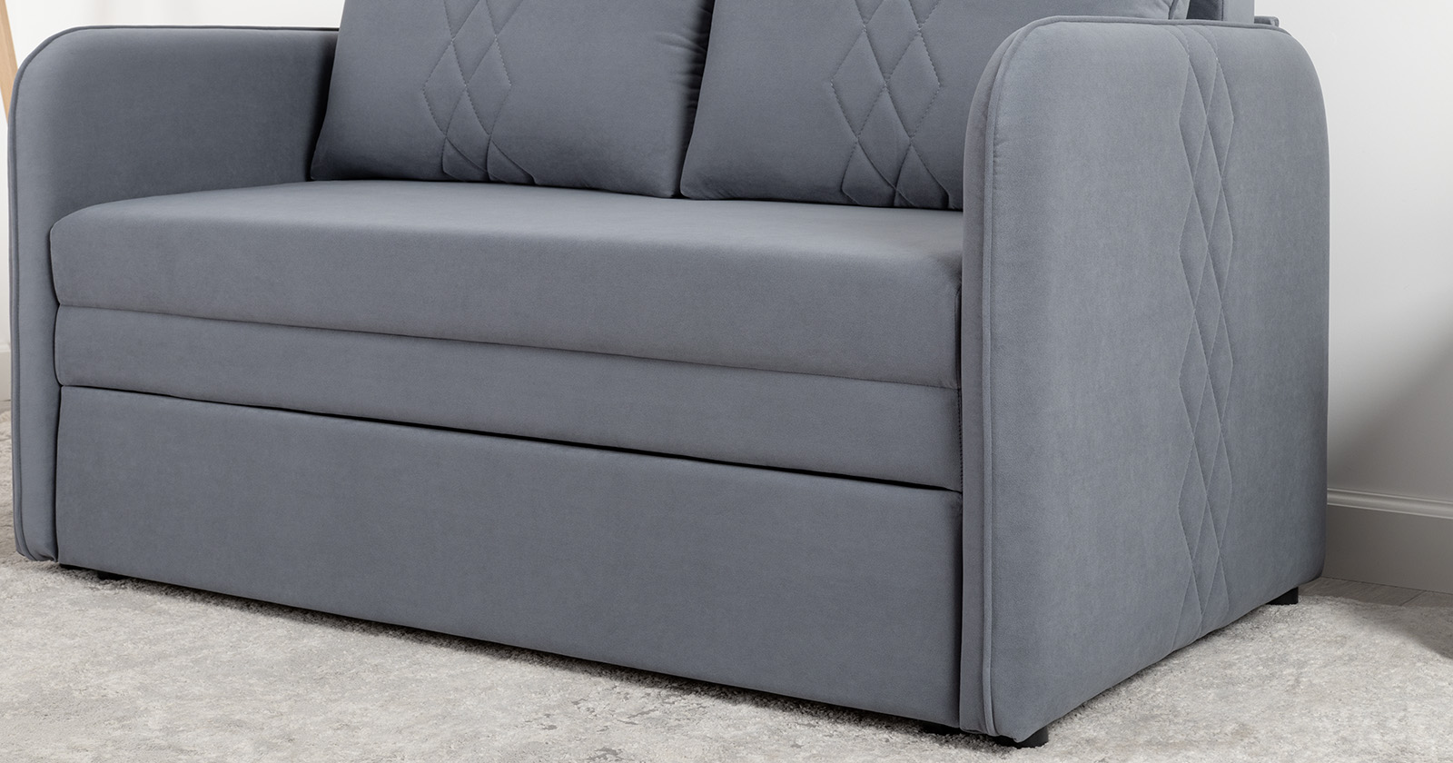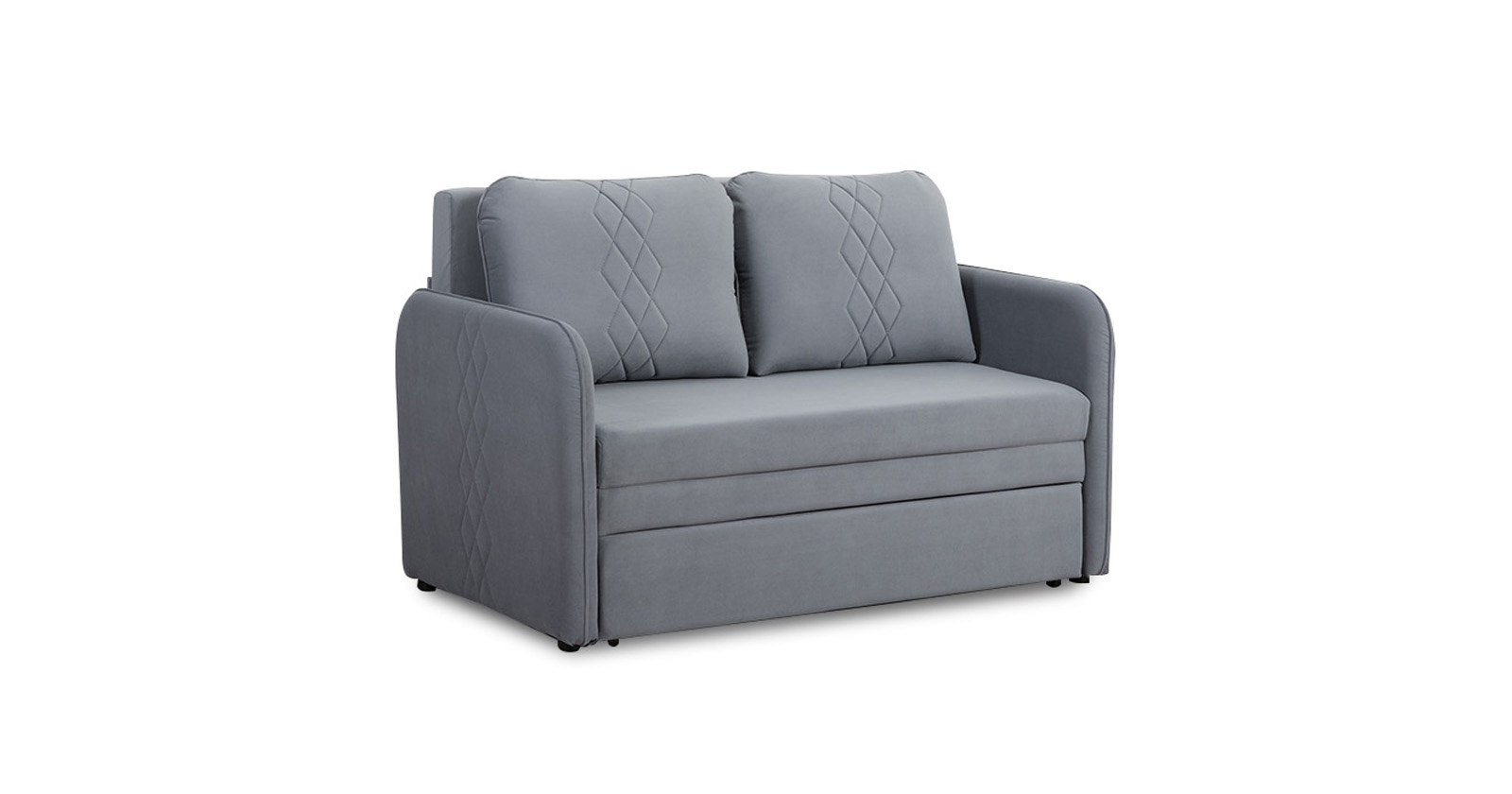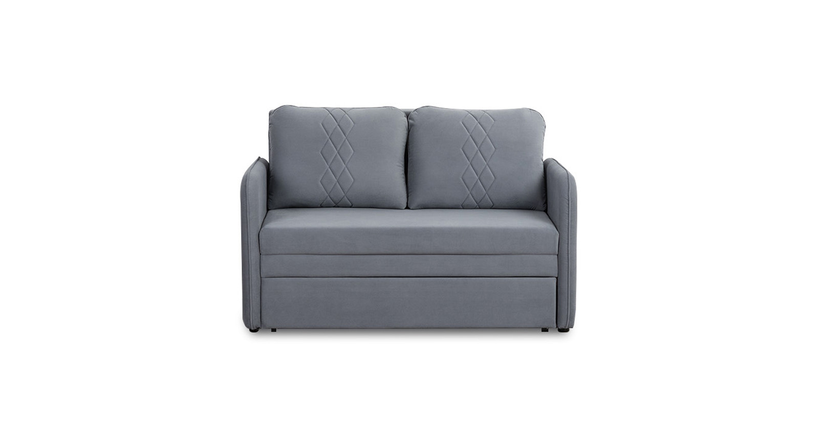 Стильный компактный диван для детской и гостиной. При своих скромных размерах он трансформируется в полноценное спальное место для детей и подростков. Лаконичный дизайн в виде декоративной стежки подчеркивает фактуру велюра, а небольшие размеры позволят разместить его в любом пространстве.