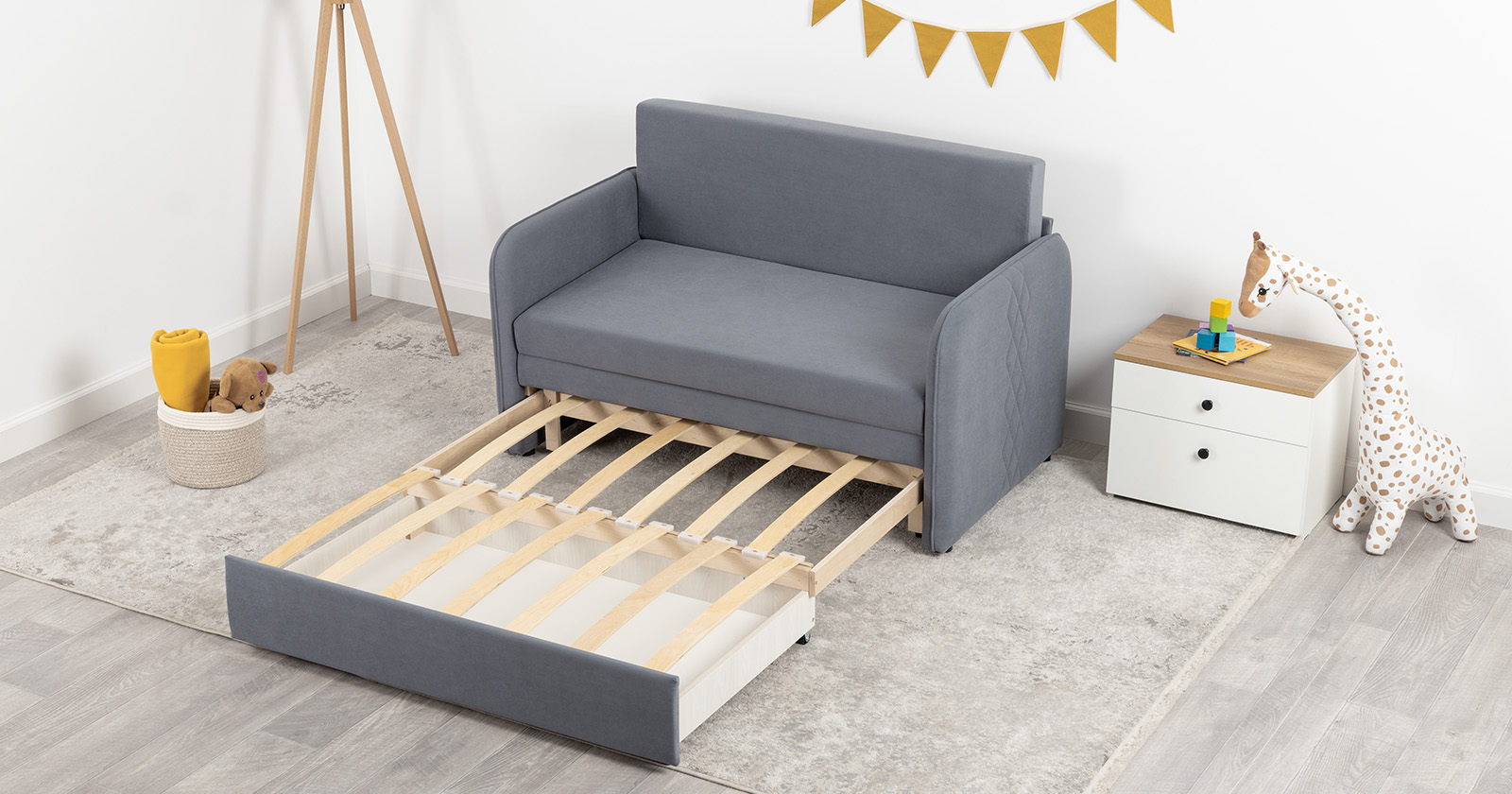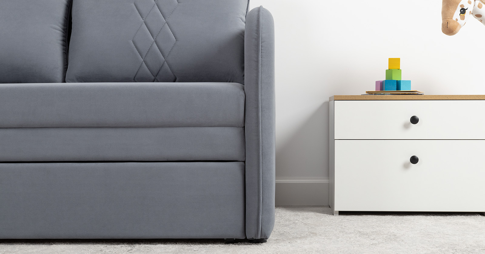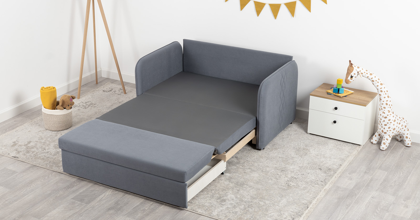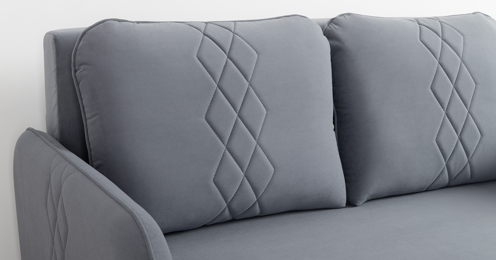 Стильный компактный диван для детской и гостиной. При своих скромных размерах он трансформируется в полноценное спальное место для детей и подростков. Лаконичный дизайн в виде декоративной стежки подчеркивает фактуру велюра, а небольшие размеры позволят разместить его в любом пространстве.