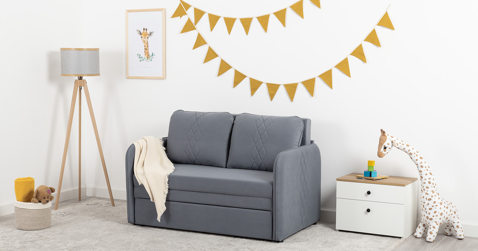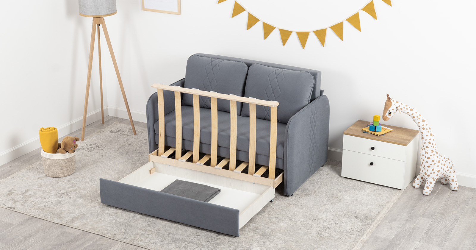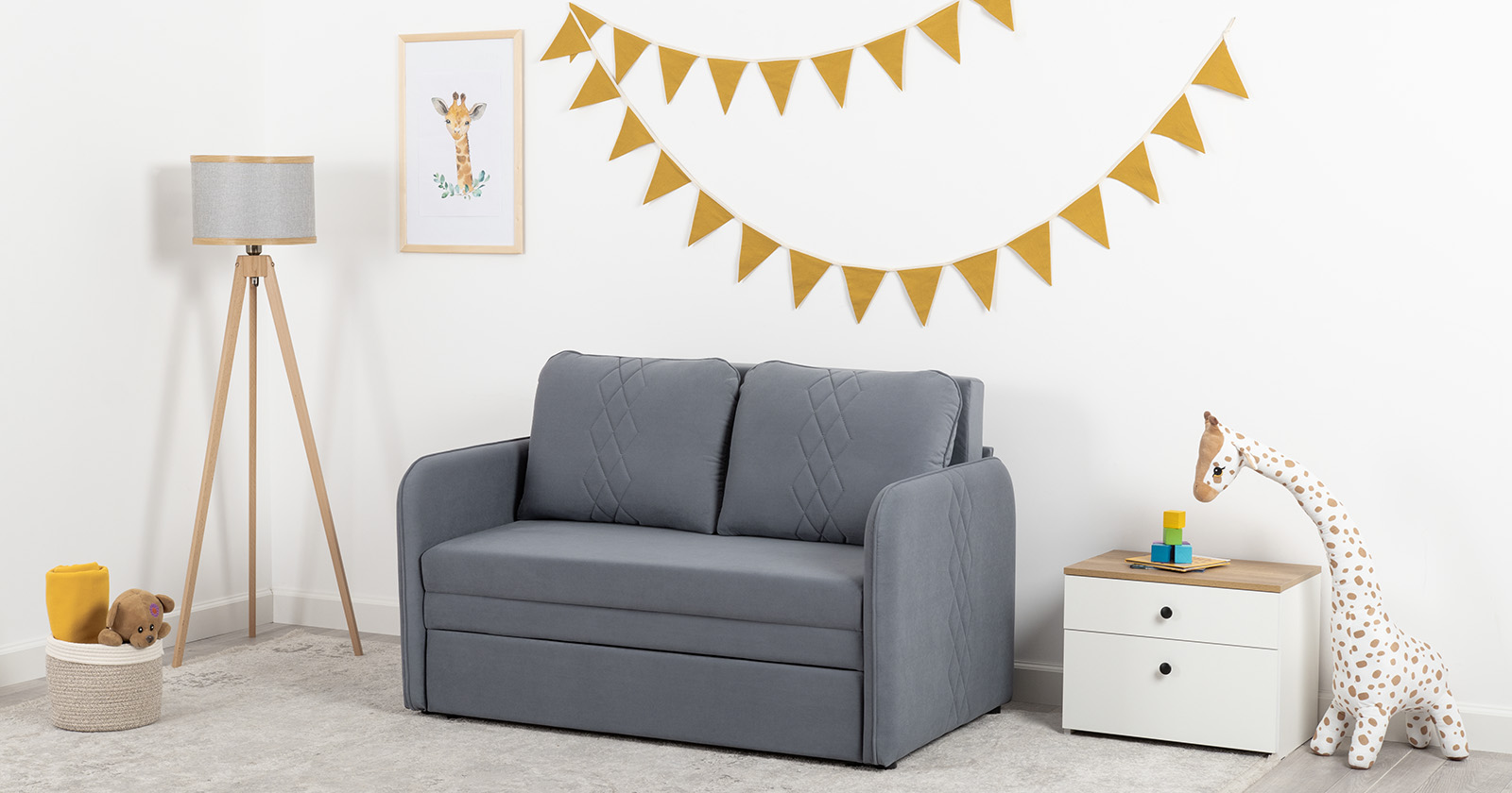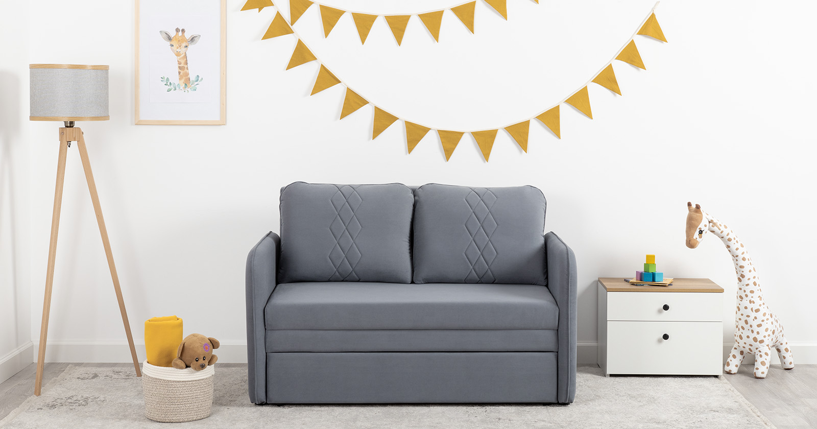 Стильный компактный диван для детской и гостиной. При своих скромных размерах он трансформируется в полноценное спальное место для детей и подростков. Лаконичный дизайн в виде декоративной стежки подчеркивает фактуру велюра, а небольшие размеры позволят разместить его в любом пространстве.