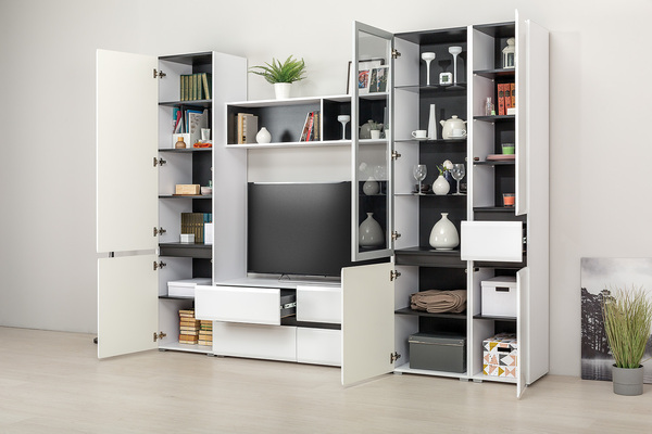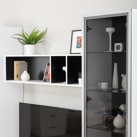 Задняя стенка чёрного цвета эффектно подчеркивает наполнение шкафов.