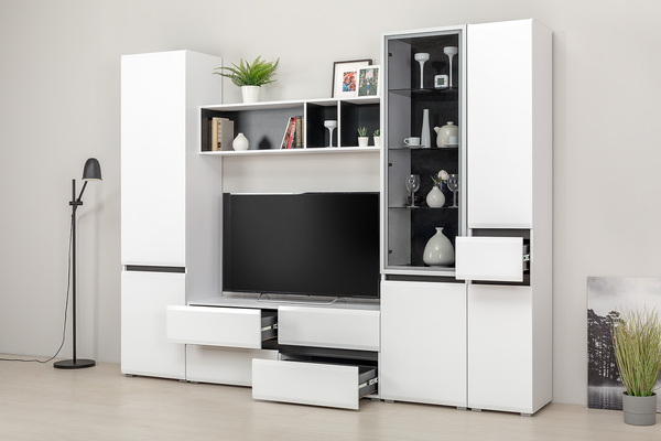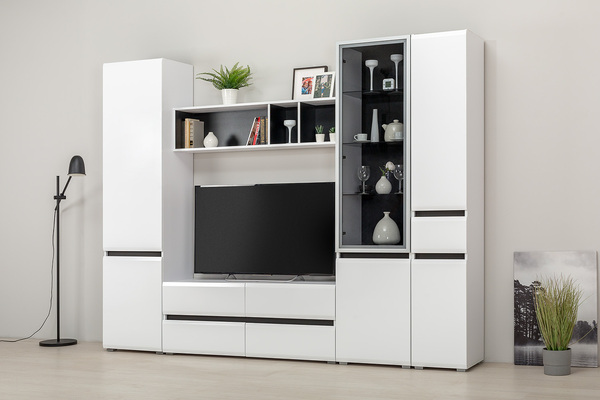 Гостиная Сидней композиция 1 белый премиум, черный, белый глянец ПВХ (универсальная сборка)