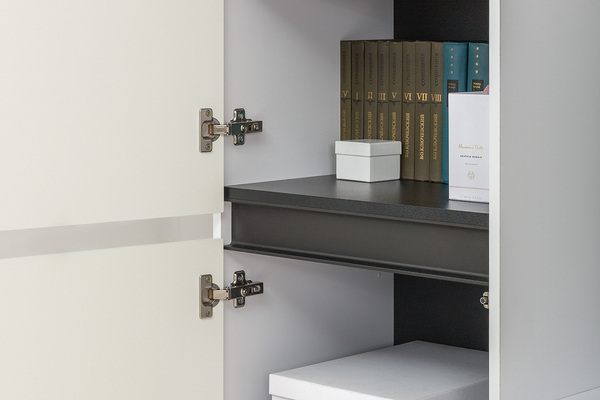 Полка крепится к боковинам соседних модулей, собирая всю компоновку в единое целое.