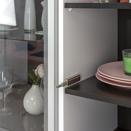 Шкаф-витрина Сидней 13.201 - Корпус шкафа выполнен из белой плиты, фасады графично разделены горизонтальной черной полосой из алюминиевого профиля, Распашные двери на четырехшарнирных петлях с доводчиками, открываются за край фасада или нажатием на фасад с помощью механизма push-to-openФрезеровка на нижнем фасаде, Верхний фасад из алюминиевого профиля с прозрачным стеклом 4 мм с серой тонировкой, Стеклянные полки за фасадом со стеклом, Светло-серые пластиковые опоры, Универсальная сборка на любую сторону, Корпус: ЛДСП 16 мм, Фасады: МДФ 16 мм и Стекло 4 мм в алюминиевом профиле.