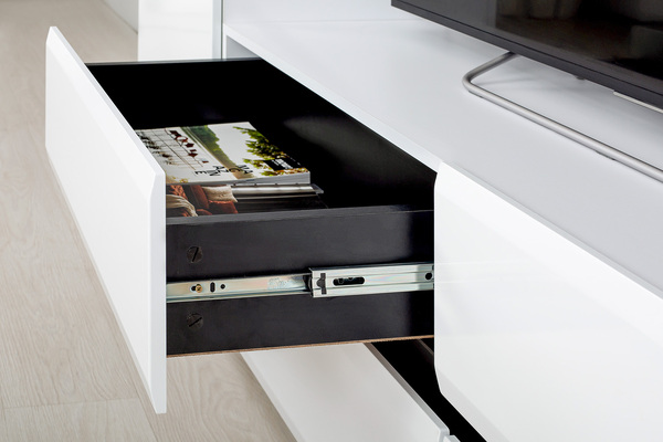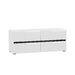 Тумба под ТВ Сидней 13.63 - 4 выдвижных ящика на шариковых направляющих полного выдвижения, Корпус тумбы выполнен из белой плиты, выдвижные ящики графично разделены горизонтальной черной полосой из алюминиевого профиля, Ящики открываются за края фасадов, Фрезеровка на фасадах, Светло-серые пластиковые опоры, Корпус: ЛДСП 16 мм, Фасады: МДФ 16 мм.