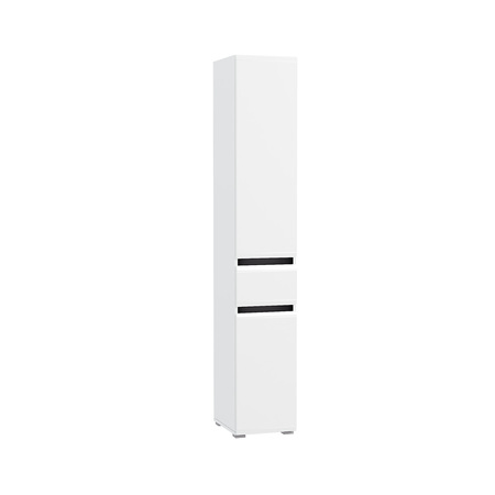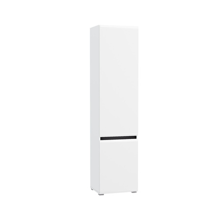 Шкаф Сидней 13.200 - Корпус шкафа выполнен из белой плиты, фасады графично разделены горизонтальной черной полосой из алюминиевого профиля, Распашные двери на четырехшарнирных петлях с доводчиками, открываются за край фасада или нажатием на фасад с помощью механизма push-to-openФрезеровка на фасадах, Светло-серые пластиковые опоры, Универсальная сборка на любую сторону, Корпус: ЛДСП 16 мм, Фасады: МДФ 16 мм.
