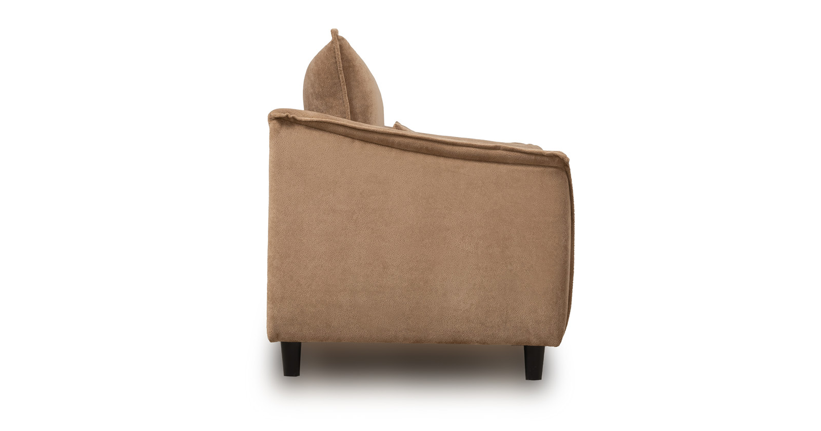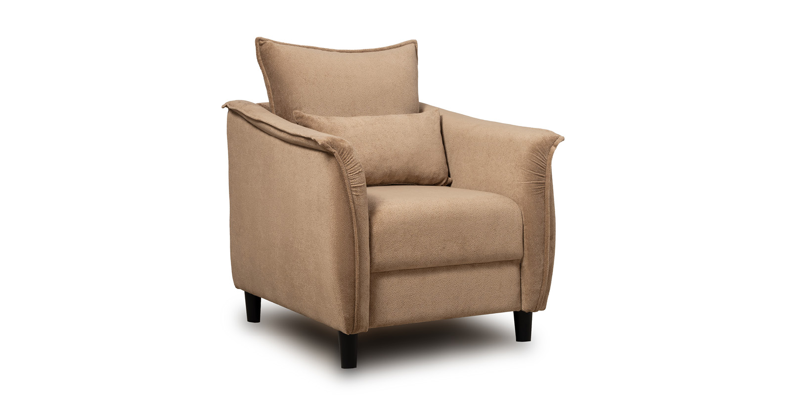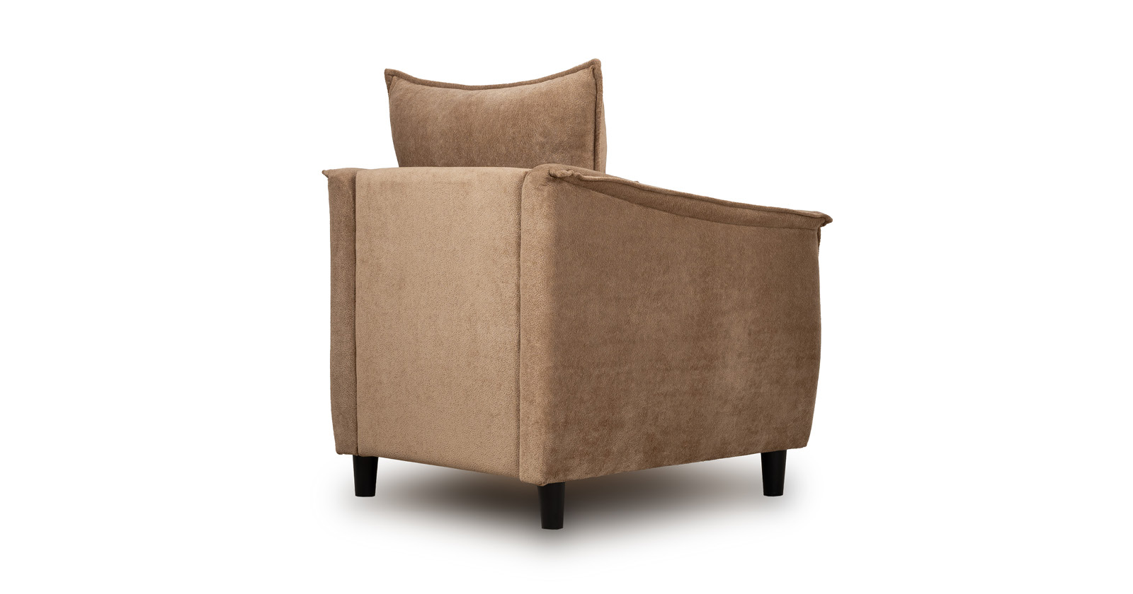 Кресло с приспинной подушкой трапецивидной формы на молнии, по трем сторонам которой проложена отделочная строчка на 1,2 см. По контуру боковин проложен декоративный кант на 1,2 см основной ткани. Кант проходит по центру передней части боковины, а по внутренней верхней части сборка.