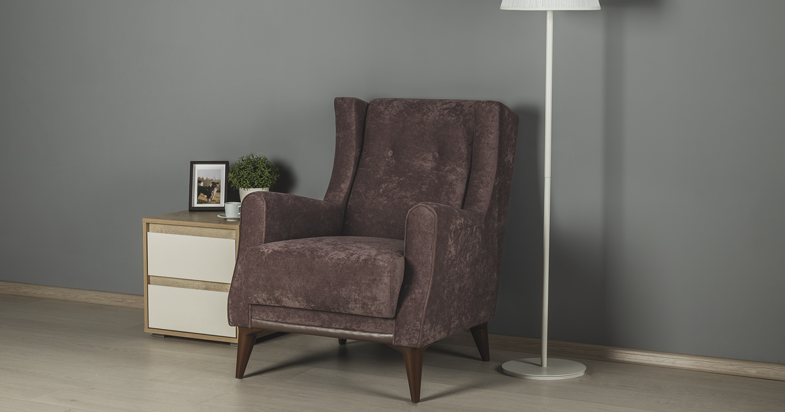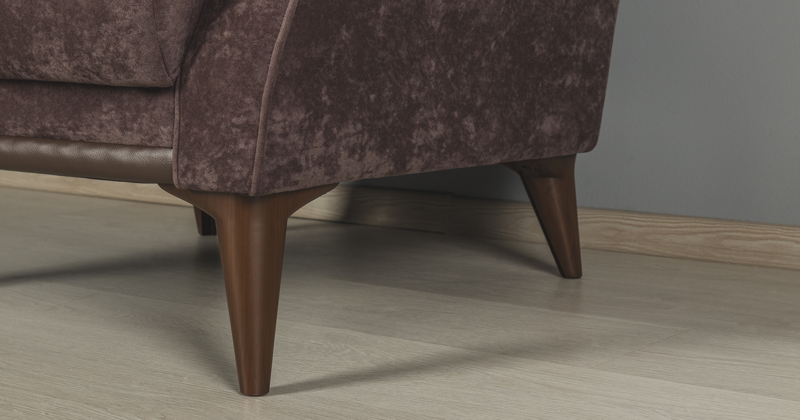 Выполнен в модном мягком велюре ROMANCE оригинальной фактуры. Ткань легко чистится, устойчива к зацепам, обладает повышенной износостойкостью. Благодаря особой технологии гладкого крашения Frozen Flower на поверхности ткани присутствует легкий краш–эффект, подчеркивающий невероятно мягкую фактуру ткани.