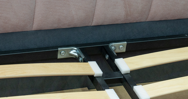 Основание кровати укомплектовано матрасодержателями. Жесткое кроватное дно из МДФ 6 мм. Задняя стенка изголовья выполнена в тех. ткани (спанбонд)
