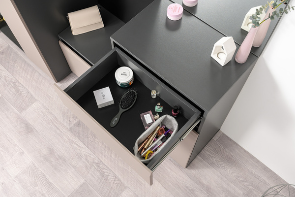 Минималистичные фасады в трендовом цвете без лицевой фурнитуры открываются за край либо нажатием (push-to-open).