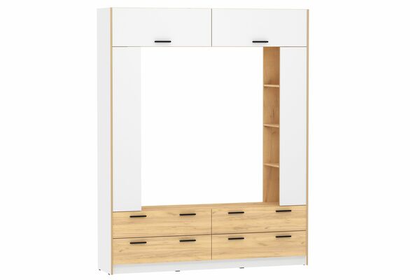 Шкафчики в верхней части стенки оснащены удобными дверками с открытием вверх. Скрытые полки за распашными дверками в средней части изделия придутся по вкусу любителям книг и интерьерных мелочей. Нижнюю часть стенки занимают четыре вместительных выдвижных ящика на шариковых направляющих, позволяющие аккуратно разместить вещи. Шкаф является модульным, что позволяет комбинировать его с другими шкафами и тумбами из одноименной коллекции. Лаконичный дизайн шкафа гармонично подчеркивается черными ручками.