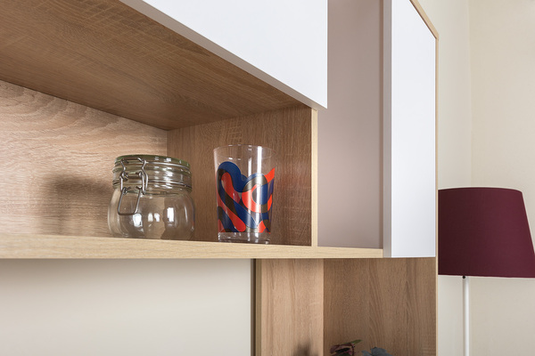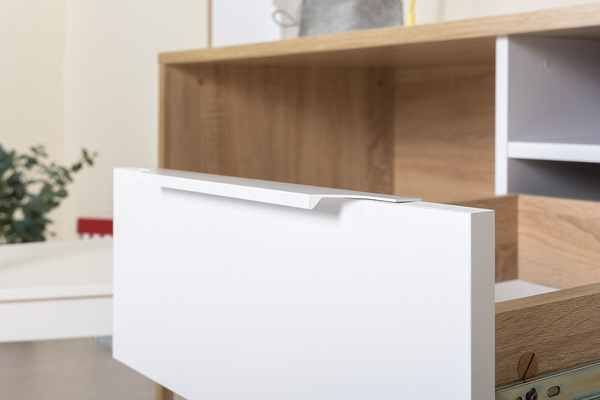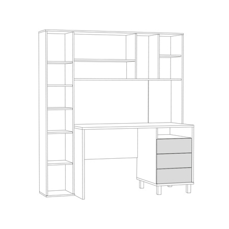 Большая рабочая зона. Распашные двери на четырёхшарнирных петлях. Выдвижные ящики на шариковых направляющих полного выдвижения. Верхний центральный фасад на газлифте, открывается за нижнюю часть фасада. Верхний правый фасад открывается за левую часть фасада. Регулируемые опоры: металл, белый матовый. Ручки: металл, белый матовый.