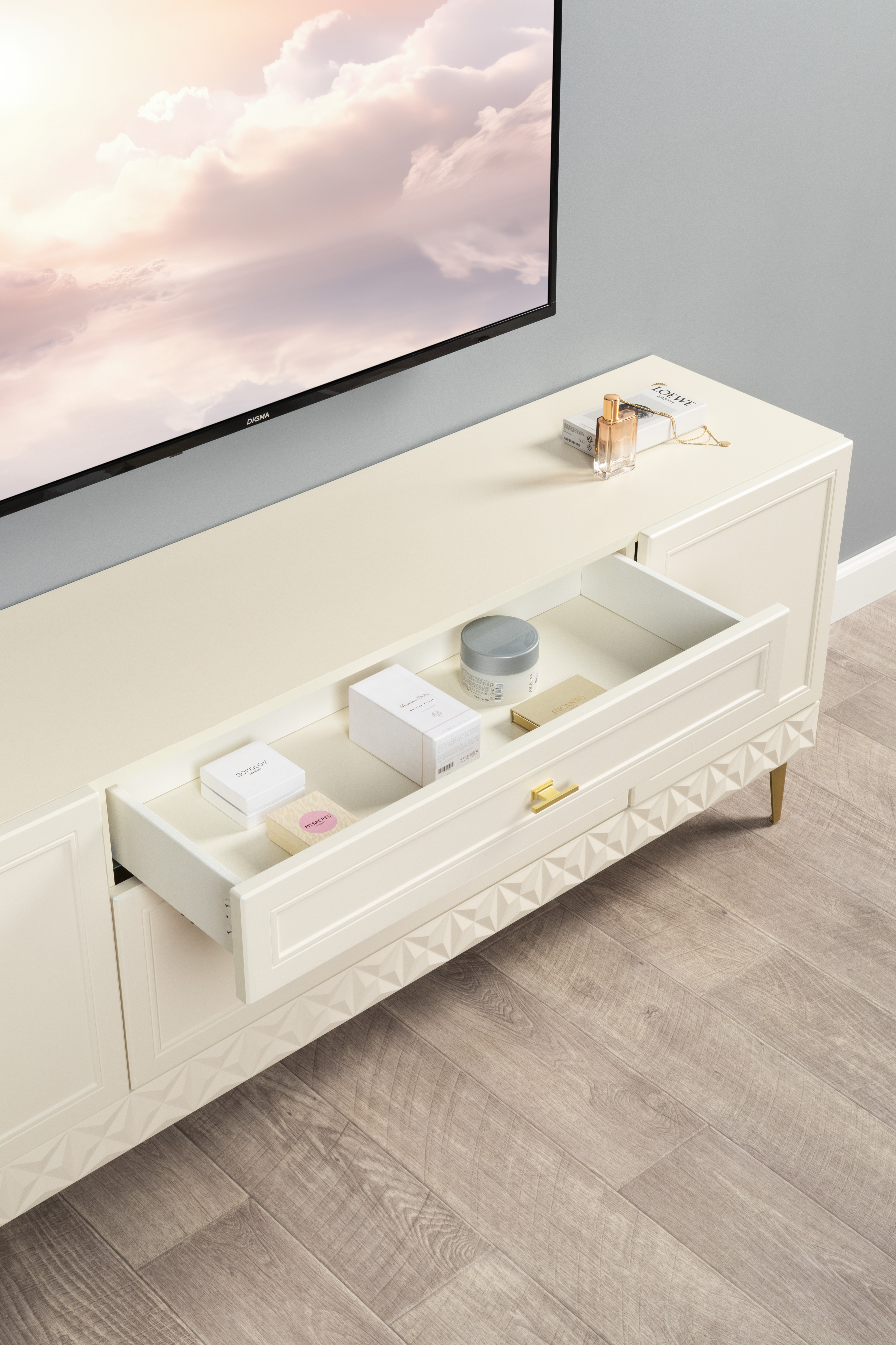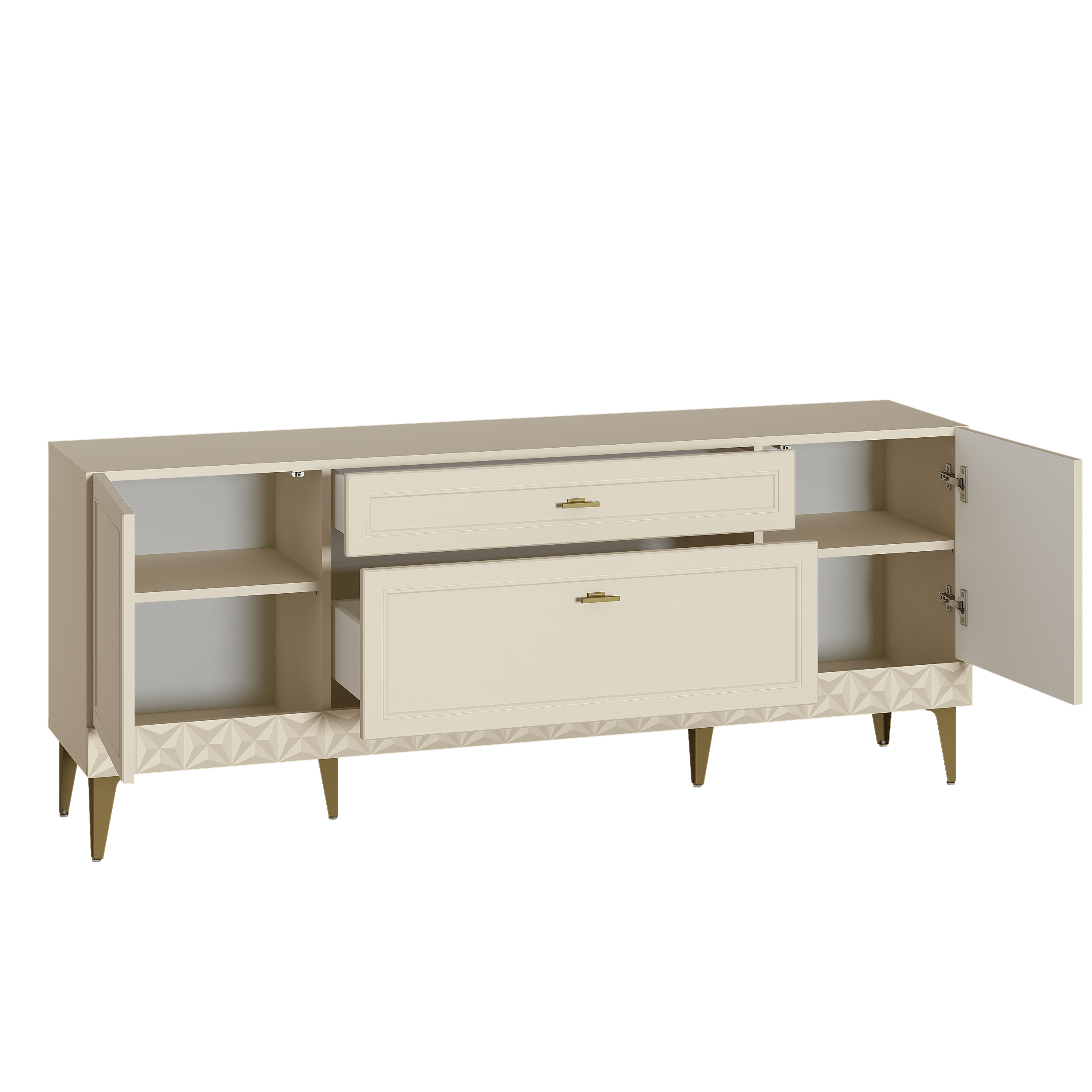 Изящные линии, глубокая фрезеровка фасадов из МДФ и благородные оттенки. Утончённая «Слоновая кость» и изысканная «Олива Шагрень» с глубоким зелёным тоном — создают атмосферу уюта, тепла и благородства. Металлические ручки и опоры золотого цвета придают мебели утончённый блеск, а петли и направляющие с доводчиками обеспечивают плавное и бесшумное закрытие фасадов.