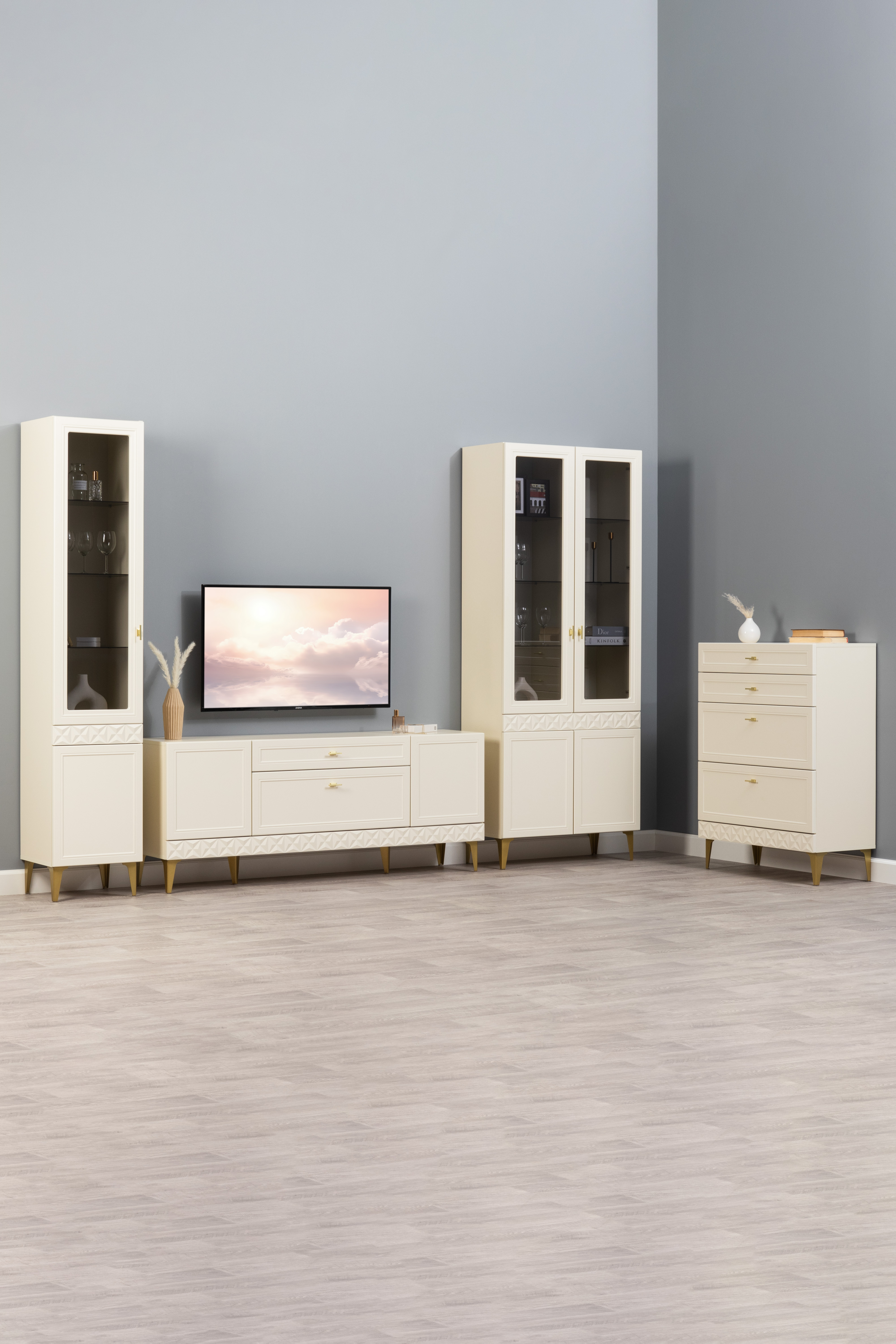 В коллекции представлены три типа витрин с тонированным закалённым стеклом, которые придают пространству лёгкость и свет. «Марион» — идеальное сочетание традиций и актуального дизайна в каждой детали.