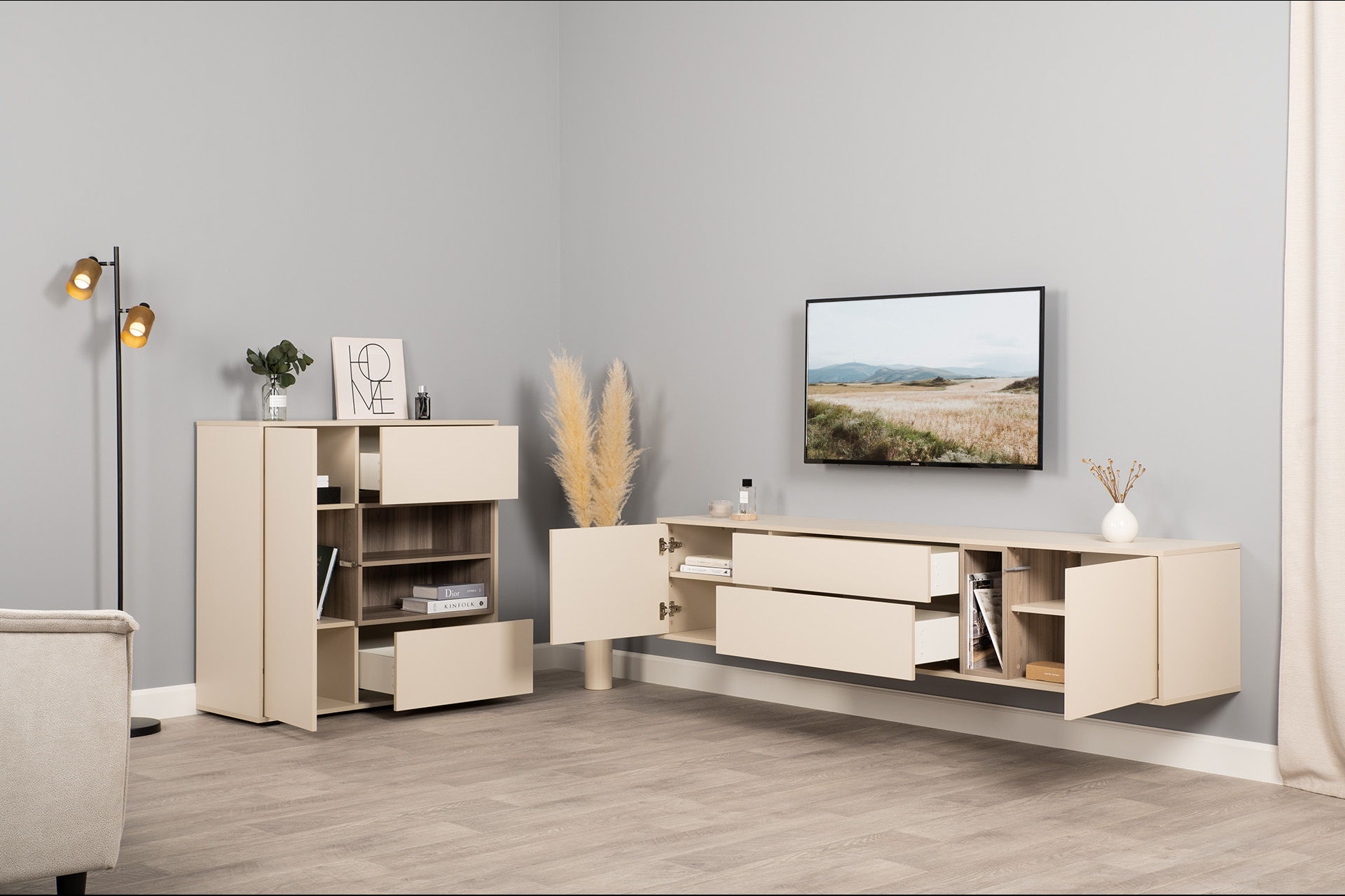 Благодаря нейтральному светлому оттенку и универсальности декора модули можно разместить в спальне, гостиной, прихожей.