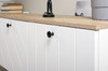 Распашные двери на четырёхшарнирных петлях с доводчиком. Опоры: металл, хром. Ручки: металл, черный матовый.