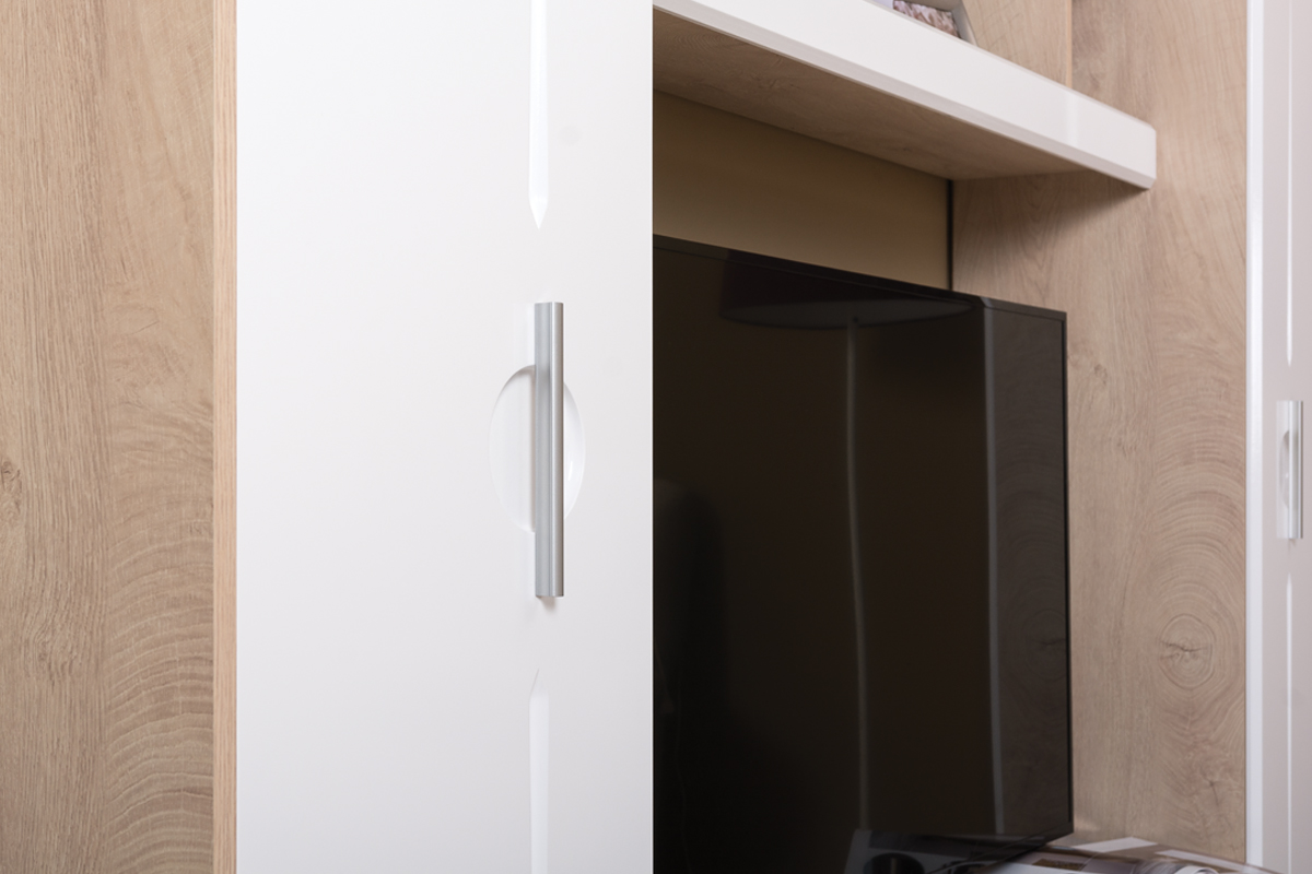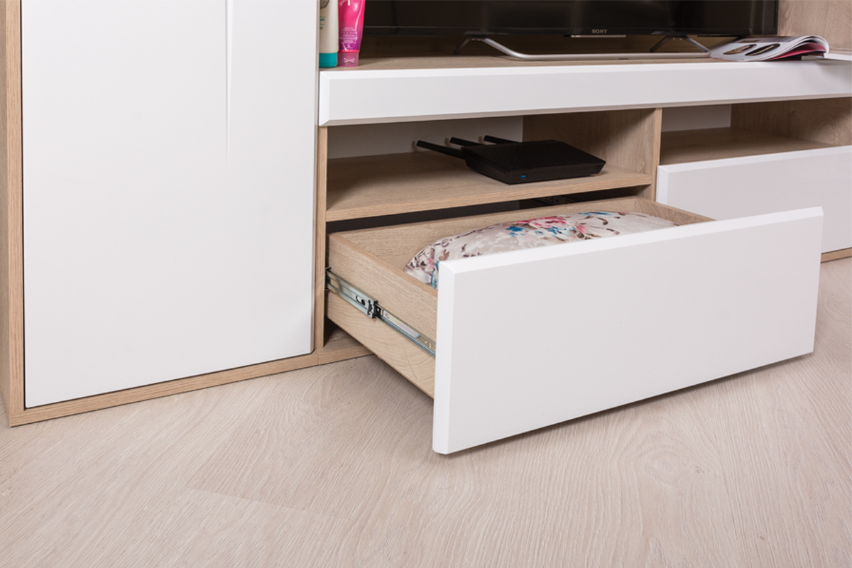 Фасады ТВ тумбы открываются за край, а фасады пеналов за металлическую ручку.